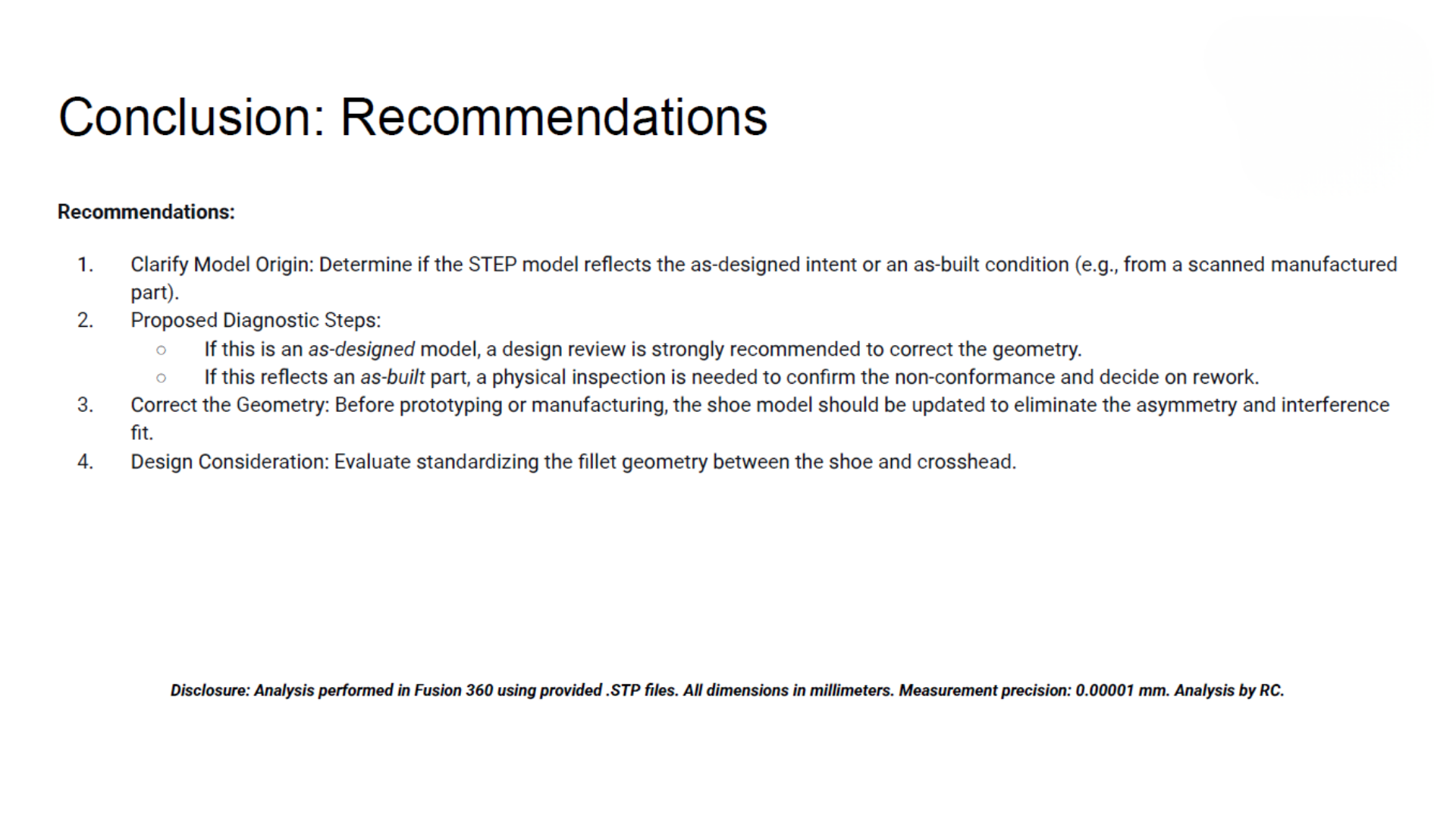 This project involved detailed dimensional verification of crosshead and shoe models to assess assembly feasibility. Analysis revealed a ~0.49 mm rail-to-guide interference, along with asymmetric rail depths and fillet mismatches affecting alignment and motion. A 1:5 scale prototype confirmed the interference, supporting design revisions that helped prevent manufacturing issues, added costs, and production delays.